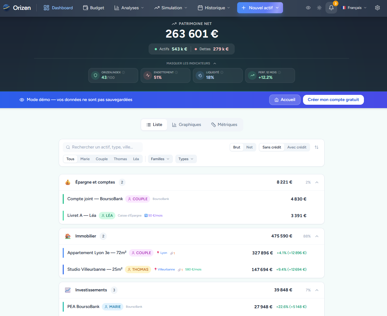 Orizen brings all your assets and liabilities together in a single dashboard. Real estate, bank accounts, stock investments, crypto, SCPI, life insurance, PEA, vehicles โ everything in one place so you can finally see the full picture.
