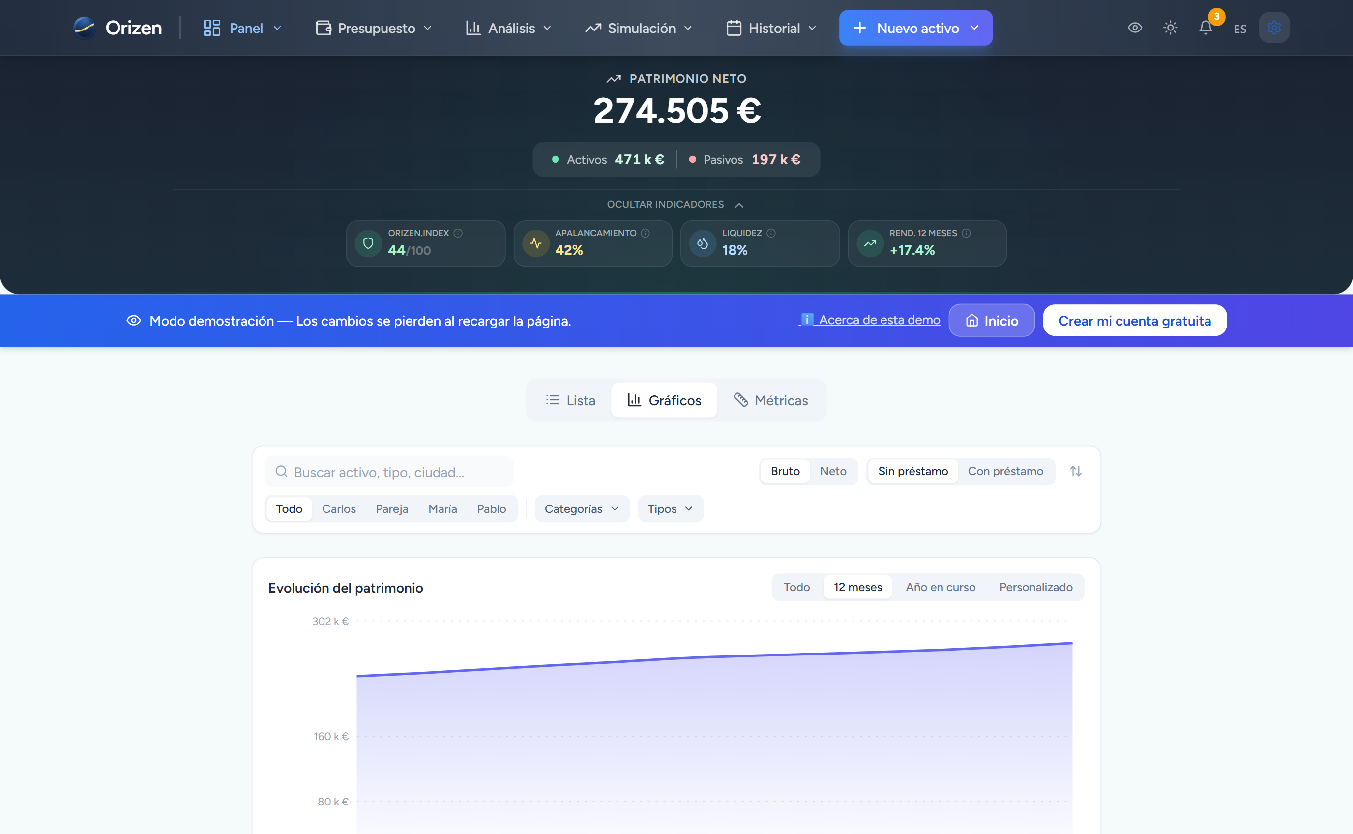 Cada activo y cada deuda está categorizado, con una valoración actualizada y un historial. Ves instantáneamente tu patrimonio neto (activos − pasivos) y cómo evoluciona con el tiempo.